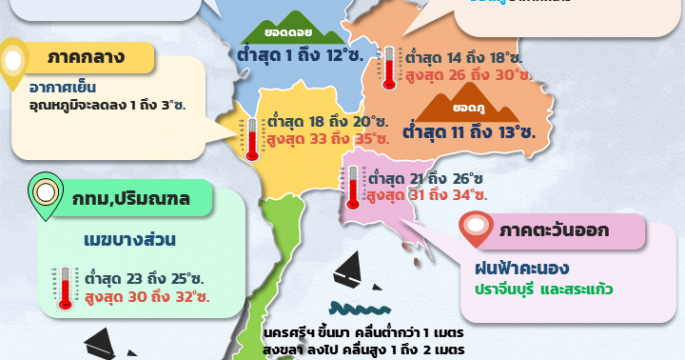 อุตุฯ เผยไทยตอนบนมีหมอกในตอนเช้า ภาคเหนือ-อีสานอากาศเย็นถึงหนาว อุณหภูมิต่ำสุด 13-22 องศาฯ ยอดดอยและยอดภูมีอากาศหนาวถึงหนาวจัด อุณหภูมิต่ำสุด 4-16 องศาฯ