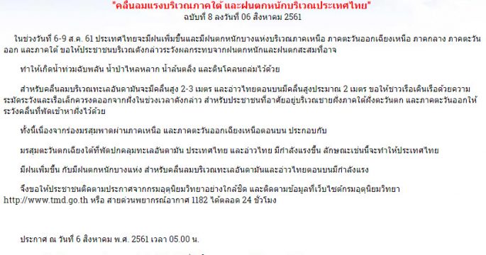กรมอุตุฯ ประกาศเตือนฉบับที่ 8 คลื่นลมแรงบริเวณภาคใต้ และฝนตกหนักบริเวณภาคเหนือ ภาคตะวันออกเฉียงเหนือ ภาคกลาง ภาคตะวันออก และภาคใต้ ระวังน้ำท่วมฉับพลัน น้ำป่าไหลหลาก น้ำล้นตลิ่ง และดินโคลนถล่ม คลื่นลมบริเวณทะเลอันดามันจะมีคลื่นสูง 2-3 เมตร และอ่าวไทยตอนบนมีคลื่นสูงประมาณ 2 เมตร ขอให้ชาวเรือเดินเรือด้วยความระมัดระวังและเรือเล็กควรงดออกจากฝั่งในช่วงเวลาดังกล่าว.