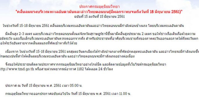 กรมอุตุนิยมวิทยาเตือนประเทศไทยจะมีปริมาณฝนเพิ่มขึ้น บริเวณภาคเหนือ ภาคตะวันออกเฉียงเหนือ ภาคตะวันออก และภาคใต้ตอนบน ขอให้ประชาชนที่อาศัยอยู่ในพื้นที่เสี่ยงภัยระวังอันตรายจากฝนที่เพิ่มขึ้นและฝนที่ตกสะสมไว้ด้วย สำหรับกรุงเทพฯ และปริมณฑล มีเมฆเป็นส่วนมาก กับมีฝนฟ้าคะนอง 60% ของพื้นที่ ส่วนมากในช่วงระหว่างบ่ายถึงค่ำ ส่วนบริเวณทะเลอันดามันมีคลื่นสูง 2-4 เมตร และบริเวณอ่าวไทยตอนบนตั้งแต่จังหวัดสุราษฎร์ธานีขึ้นมาห่างฝั่งมีคลื่นสูง 2-3 เมตร .