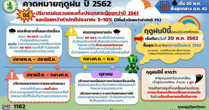 กรมอุตุฯ ประกาศประเทศไทยจะเข้าสู่ฤดูฝน 20 พ.ค. สิ้นสุดประมาณกลางเดือน ต.ค.62 คาดหมายฤดูฝนปี 62 ปริมาณฝนรวมของทั้งประเทศจะน้อยกว่าปี 61 และน้อยกว่าค่าปกติประมาณ 5-10% (ปีที่แล้วน้อยกว่าค่าปกติ 3%)