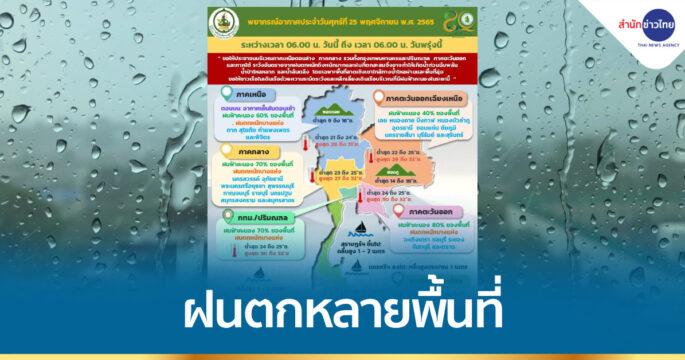 กรมอุตุฯ เตือน 22-23 พ.ย. 65 ฝนตกหนักมากในภาคใต้ฝั่งตะวันตก ระวังน้ำท่วมฉับพลัน น้ำป่าไหลหลาก ขณะที่ภาคอีสานตอนล่าง ภาคตะวันออก และภาคใต้ฝั่งตะวันออก ฝนตกหนักบางแห่ง