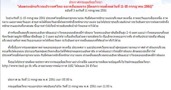 กรมอุตุฯ เผยไทยมีฝนลดลง แต่ยังมีฝนตกต่อเนื่องกับมีฝนตกหนักบางแห่งบริเวณภาคเหนือ ภาคตะวันออกเฉียงเหนือ ภาคกลาง ภาคตะวันออก และภาคใต้ ระวังน้ำท่วมฉับพลัน น้ำป่าหลาก ทะเลอันดามันและอ่าวไทยตอนบน คลื่นสูง 2-3 เมตร ส่วน กทม.-ปริมณฑล ฝน 60% ของพื้นที่.