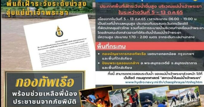 กรมอุทกศาสตร์ ออกประกาศเตือนเฝ้าระวังระดับน้ำทะเลหนุนสูงในพื้นที่กรุงเทพมหานครและใกล้เคียง 5-13 ต.ค.65 โดยระดับน้ำแม่น้ำเจ้าพระยาจะสูงประมาณ 1.70-2.00 เมตร จากระดับทะเลปานกลาง