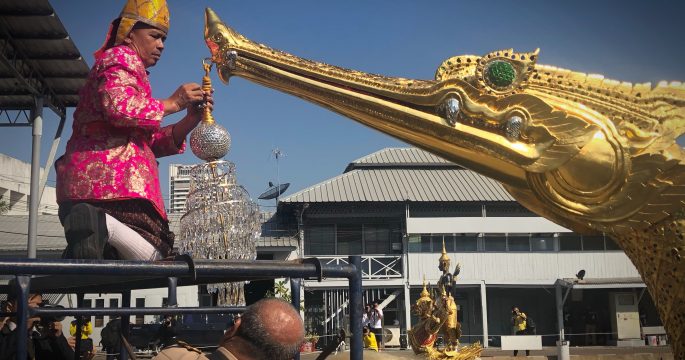 กำลังพลฝีพายเรือพระที่นั่งสุพรรณหงส์สักการะแม่ย่านางเรือเพื่อความเป็นสิริมงคลก่อนเคลื่อนเรือออกจากอู่ทหารเรือธนบุรีไปยังท่าวาสุกรี เพื่อทำการฝึกซ้อมครั้งสุดท้าย