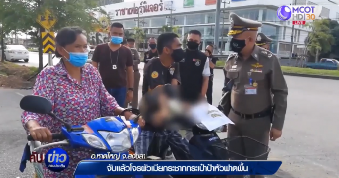 ตำรวจจับสองสามีภรรยาวัยรุ่น กระชากกระเป๋าหญิงวัย 63 ปี จนรถจักรยานยนต์ล้ม หัวฟาดพื้น พบฝ่ายภรรยาท้องแก่ใกล้คลอด จึงคุมตัวสามีไปทำแผนคนเดียว