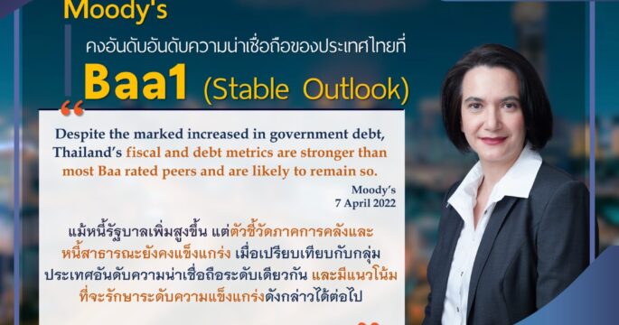 กระทรวงการคลัง 8 เม.ย.-Moody’s คงอันดับความน่าเชื่อถือของประเทศไทย Baa1 และมุมมองความน่าเชื่อถือที่ระดับมีเสถียรภาพ คาดจีดีพีไทยขยายตัวร้อยละ 3.4 แนะทำนโยบายการคลังผ่อนคลาย เพื่อลดหนี้สาธารณะ ขณะที่ ADB เห็นสัญญาณเศรษฐกิจไทยฟื้น