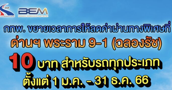 กรุงเทพฯ 16 ม.ค.-กทพ. ขยายเวลาการให้ลดค่าผ่านทางพิเศษที่ด่านฯ พระราม 9-1 (ฉลองรัช) 10 บาท สำหรับรถทุกประเภท ตั้งแต่ 1 มกราคม – 31 ธันวาคม 2566 ทั้งนี้ ตั้งแต่ 1 กรกฎาคม 2566 จะให้ส่วนลดเฉพาะผู้ใช้บัตร Easy Pass เท่านั้น