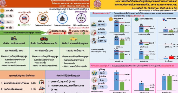 กระทรวงคมนาคม สรุปตัวเลขภาพรวมการเดินทางในเทศกาลปีใหม่ 2568 บนโครงข่ายของ คค. รวม 4 วัน (27-30 ธันวาคม 2567) อุบัติเหตุลดลง 9% สาเหตุหลักใช้ความเร็วเกินกำหนด เกิดจากรถจักรยานยนต์มากที่สุด เตรียมความพร้อมทุกมิติอำนวยความสะดวกประชาชนช่วงคืนเคาท์ดาวน์ ต่อเนื่องถึงช่วงเดินทางเที่ยวกลับท้ายเทศกาลให้มีความสะดวก ปลอดภัย