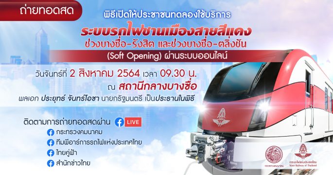สิ้นสุดการรอคอยนับ 10 ปี วันนี้นายกรัฐมนตรี กดปุ่มเปิดทดลองเดินรถไฟชานเมืองสายสีแดง ให้ประชาชนทดลองใช้บริการฟรี จนถึงปลาย พ.ย. 64 ขึ้นอยู่กับสถานการณ์โควิด-19 ก่อนเปิดให้บริการเชิงพาณิชย์อย่างเป็นทางการ พร้อมคุมจำนวนผู้ใช้บริการไม่เกิน 50% ของขบวนตามมาตรการป้องกันโควิด-19
