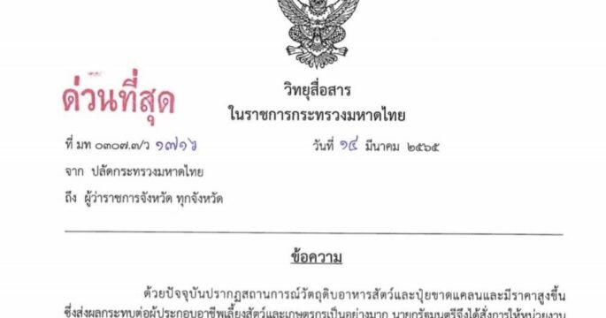 มท.1 สั่งการผู้ว่าฯ ทั่วประเทศ ให้กำหนดเนื้อสุกร หรือโภคภัณฑ์อื่น ๆ ที่ขาดแคลนอย่างผิดปกติ เป็นโภคภัณฑ์ที่ต้องทำการสำรวจในท้องที่จังหวัด หากพบการกระทำผิดกฎหมาย ให้ดำเนินการอย่างเด็ดขาด