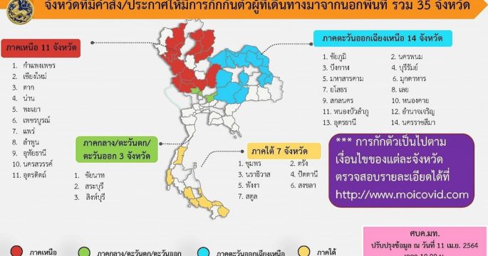 จังหวัดที่มีคำสั่ง/ประกาศให้มีการกักกันตัวผู้ที่เดินทางมาจากนอกพื้นที่ รวม 35 จังหวัด (ข้อมูล ณ วันที่ 11 เม.ย.64 / 10.00 น.)
