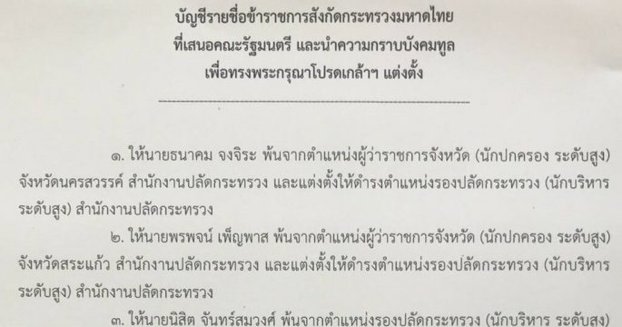 ที่ประชุม ครม. เห็นชอบแต่งตั้งโยกย้ายข้าราชการระดับสูงของกระทรวงมหาดไทย 18 ตำแหน่ง “นิสิต จันทร์สมวงศ์” นั่งอธิบดีกรมการพัฒนาชุมชน ด้าน “ประยูร รัตนเสนีย์” เป็นอธิบดีกรมที่ดิน ขณะที่กระทรวงพาณิชย์ ให้ “บุณยฤทธิ์ กัลยาณมิตร” นั่งปลัดกระทรวงพาณิชย์