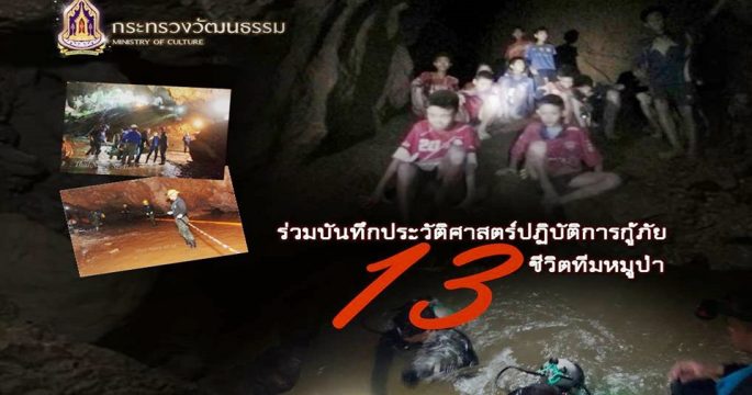 วธ.ชวนสื่อ-ประชาชน ร่วมส่งภาพ ข้อมูล เหตุการณ์ต่างๆ ในการช่วยเหลือ 13 ชีวิตหมูป่าติดถ้ำหลวง จัดทำบันทึกจดหมายเหตุ เหตุการณ์ ครั้งสำคัญของโลก