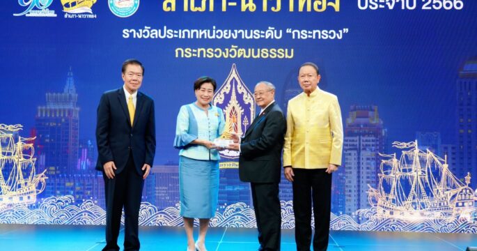 กทม. 14ก.ย.- กระทรวงวัฒนธรรม รับรางวัล “สำเภา-นาวาทอง” ปี 2566 จากหอการค้าไทยและสภาหอการค้าแห่งประเทศไทย เชิดชูเป็นหน่วยงานภาครัฐที่ปรับปรุงกระบวนงานอย่างมีประสิทธิภาพ ลดอุปสรรคในการดำเนินงานอย่างเห็นผล พร้อมปรับบทบาท “กระทรวงสังคมกึ่งเศรษฐกิจ” ยกระดับ Soft Power ไทยในเวทีโลก นางยุพา ทวีวัฒนะกิจบวร ปลัดกระทรวงวัฒนธรรม เข้ารับมอบรางวัล “สำเภา-นาวาทอง” ปี 2566 จากหอการค้าไทยและสภาหอการค้าแห่งประเทศไทย โดยมี ดร.สุเมธ ตันติเวชกุล กรรมการและเลขาธิการ มูลนิธิชัยพัฒนา นายสนั่น อังอุบลกุล ประธานกรรมการหอการค้าไทยและสภาหอการค้าแห่งประเทศไทย นายสุรงค์ บูลกุล รองประธานกรรมการ และประธานคณะทำงานจัดงานมอบรางวัลฯ ผู้แทนหน่วยงานที่ได้รับรางวัล เจ้าหน้าที่ที่เกี่ยวข้อง แขกผู้มีเกียรติ และสื่อมวลชน เข้าร่วม ณ ห้องประชุม อาคาร 2 ชั้น 7 มหาวิทยาลัยหอการค้าไทย โดยภายในงานมีการฉายวีดิทัศน์แนะนำโครงการฯ การบรรยายพิเศษ เรื่อง “Digital Disruption : ทิศทางการปรับตัวของภาครัฐกับการให้บริหารภาคธุรกิจและประชาชน” […]