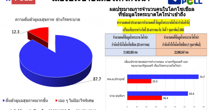 ผลสำรวจพบประชาชนเชื่อมั่นกระทรวงสาธารณสุขสามารถควบคุมสถานการณ์การระบาดของเชื้อไวรัสโคโรนาได้ และยังเห็นว่านายกรัฐมนตรีและรัฐมนตรีสาธารณสุข ทำเต็มที่แล้ว