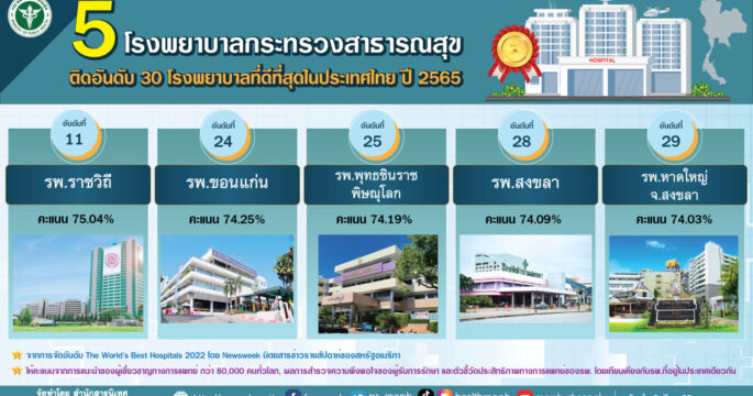 ปลัดกระทรวงสาธารณสุข เผย 5 โรงพยาบาลสังกัดกระทรวงสาธารณสุข ติดท็อป 30 โรงพยาบาลที่ดีที่สุดในประเทศไทย ปี 2565 ได้แก่ รพ.ราชวิถี, รพ.ขอนแก่น, รพ.พุทธชินราช พิษณุโลก, รพ.สงขลา และ รพ.หาดใหญ่ จัดอันดับโดยนิตยสารชื่อดังระดับโลก ภายใต้โครงการ The World’s Best Hospitals 2022