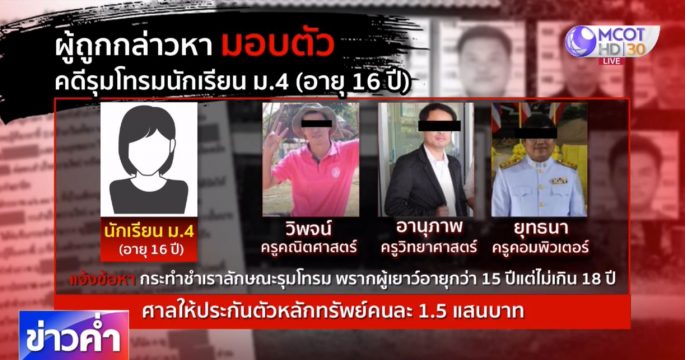 ครู 3 คนที่ถูกแจ้งดำเนินคดีฐานรุมโทรมนักเรียนหญิง ม.4 เข้ามอบตัวสู้คดี และได้รับการประกันตัวในชั้นศาลออกไปแล้ว รมว.ยุติธรรม เตรียมประสานอัยการให้สืบพยานในคดีไว้ก่อน หวั่นอาจมีการยอมความ