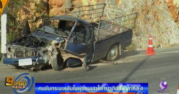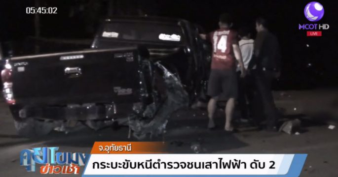 คนร้ายขับรถกระบะหนีตำรวจเสียหลักชนป้ายเหล็กและเสาไฟฟ้าข้างทางที่ จ.อุทัยธานี เสียชีวิต 2 ราย ส่วนเจ้าหน้าที่บาดเจ็บ 3 นาย