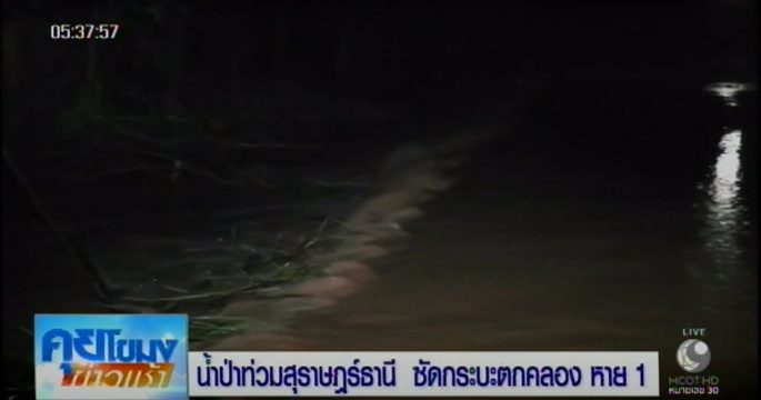 น้ำป่าหลากท่วมสุราษฎร์ธานี พัดรถกระบะตกคลอง ช่วยได้ 1 คน ยังสูญหายอีก 1 คน