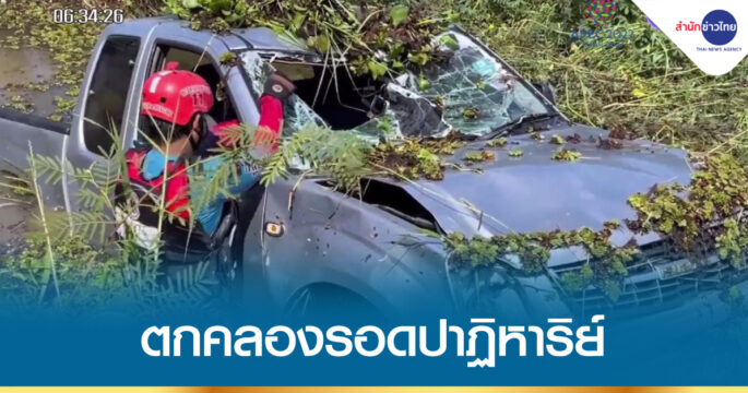 หนุ่มขับกระบะฝ่าความมืด ก่อนวูบหลับแหกโค้งพุ่งตกลงไปในคลอง จมหายไปทั้งคัน รอดตายปาฏิหาริย์ โชว์พระเต็มหน้ารถ