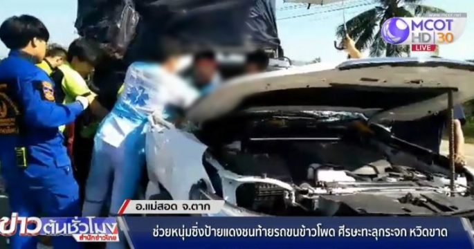 หนุ่มขับกระบะป้ายแดงชนท้ายรถบรรทุกหกล้อขนข้าวโพด บนถนนสายแม่สอด-อุ้มผาง เขต อ.แม่สอด จ.ตาก ศีรษะพุ่งทะลุกระจก คอไปค้างติดอยู่ด้านหน้า เจ้าหน้าที่ต้องใช้เครื่องตัดถ่างงัดซากรถ ใช้เวลา 20 นาที จึงนำตัวออกมาได้สำเร็จ