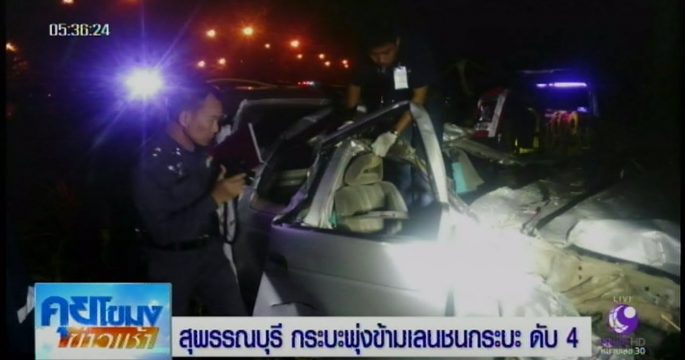 พ่อค้าขับรถกระบะพุ่งข้ามเลน ชนรถกระบะของดาบตำรวจ บริเวณถนนสาย 324 อู่ทอง-กาญจนบุรี ทำให้มีผู้เสียชีวิต 4 ราย