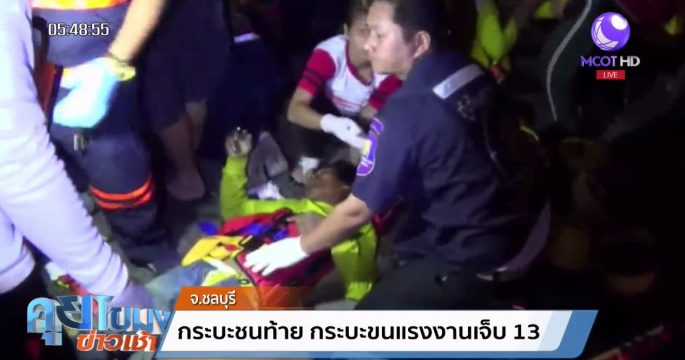 รถกระบะพุ่งชนท้ายรถกระบะรับ-ส่งคนงานก่อสร้างที่กำลังจอดรอเลี้ยวเข้าแคมป์ที่พัก ทำให้มีผู้ได้รับบาดเจ็บ 13 ราย อาการสาหัส 1 ราย