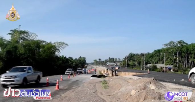 ฝนที่ตกหนักเมื่อคืนที่ผ่านมา เกิดน้ำป่าหลากเข้าท่วม 7 ตำบลเขาต่อ กระแสน้ำยังกัดเซาะถนนสายเขาต่อ – พนม ทรุดตัวเป็นแนวยาว