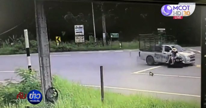 คลิปจากกล้องบันทึกนาทีชีวิต รถกระบะเฉี่ยวชนรถจักรยานยนต์อย่างแรง ทำสองนักท่องเที่ยวชาวจีนที่ขับขี่ล้มกลิ้งบนถนน ได้รับบาดเจ็บ ก่อนจะขับหลบหนีไป บริเวณสามแยกวัดคลองสน อ.เมือง จ.กระบี่