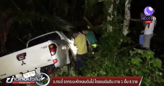 กระบะหักหลบต้นไม้ที่ล้มขวางถนน เสียหลักพุ่งเข้าป่าชนกับต้นไม้ บนถนนเพชรเกษม ขาเข้าตัวเมืองกระบี่ ทำผู้ใหญ่บ้านหมู่ที่ 1 ต.นาโพธิ์ อ.ทุ่งสง จ.นครศรีธรรมราช เสียชีวิต และมีผู้บาดเจ็บอีก 6 คน