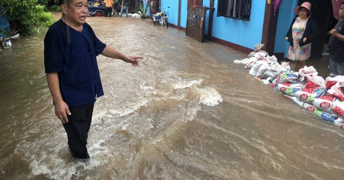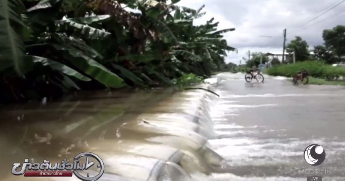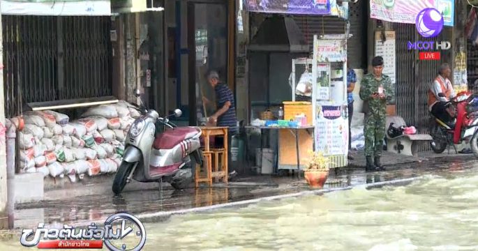 ถนนหลายสายในเขตเทศบาลเมืองเพชรบุรี เริ่มมีน้ำจากแม่น้ำเพชรบุรีทะลักเข้าท่วม ประชาชนเร่งเสริมแนวกระสอบทรายกั้นน้ำ