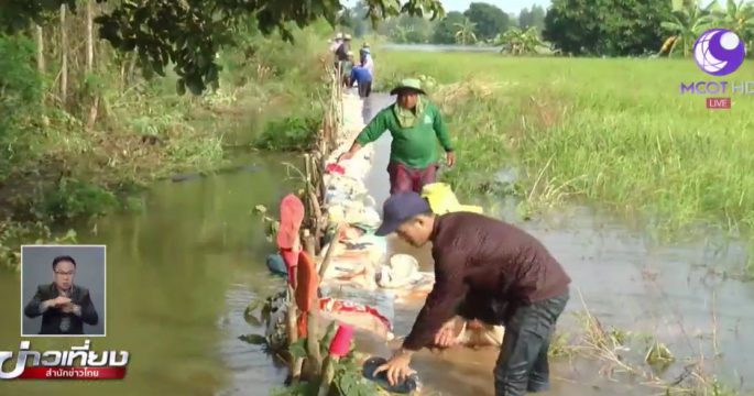 ทหาร ชาวบ้าน และนักศึกษา เร่งวางกระสอบทรายวางแนวป้องกันน้ำจากแม่น้ำชีที่กำลังไหลทะลักเข้าท่วมพื้นที่การเกษตร 3 ตำบล รวมถึงเขตเศรษฐกิจ จ.มหาสารคาม