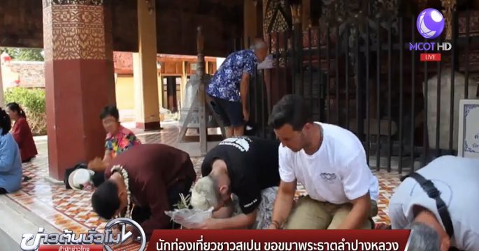 นักท่องเที่ยวชาวสเปนนำดอกไม้ธูปเทียนกราบขอขมาองค์พระธาตุลำปางหลวง หลังนำเครื่องร่อนขึ้นบินเหนือพระธาตุลำปางหลวง หลายรอบ จนชาวบ้านออกมาตำหนิ ถึงความไม่เหมาะสม