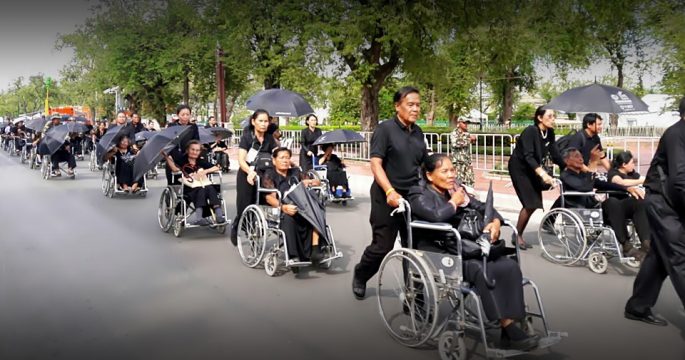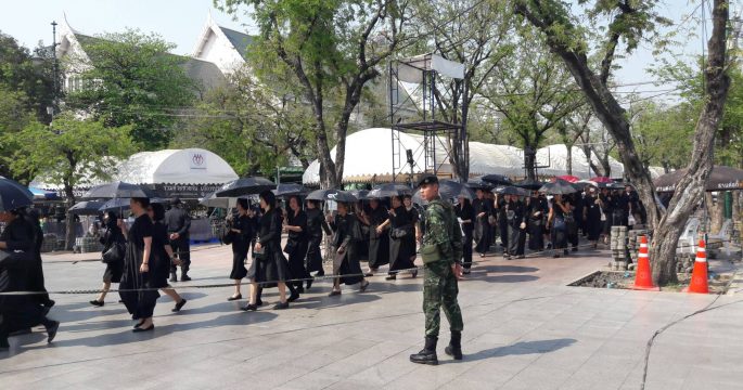 ประชาชนจำนวนมากรอเข้ากราบถวายบังคมพระบรมศพในหลวงรัชกาลที่ 9 ท่ามกลางสภาพอากาศร้อนจัด ขณะที่มีจิตอาสาทยอยแจกน้ำและอาหารอย่างต่อเนื่อง