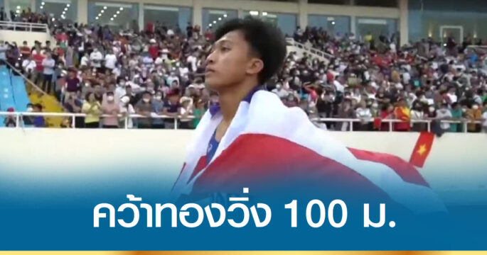 “บิว” ภูริพล บุญสอน ลมกรดหนุ่มทีมชาติไทย มาเร่งสปรินท์ในช่วง 20 เมตรสุดท้าย เข้าเส้นชัยเป็นคนแรก คว้าเหรียญทองที่ 3 ให้กับตัวเอง ในวิ่ง 100 เมตรชาย