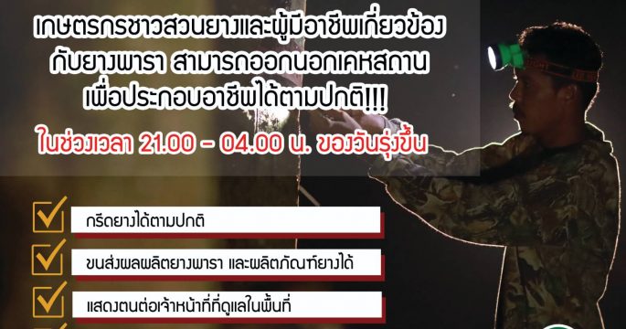 กยท.ระบุชาวสวนยางและผู้มีอาชีพเกี่ยวข้องกับยางพาราได้รับการยกเว้นให้สามารถออกนอกเคหสถาน เพื่อประกอบอาชีพ ในเวลาตั้งแต่ 3 ทุ่ม-ตี 4 ได้ แต่ย้ำให้ปฏิบัติตามมาตรการป้องกันโรคอย่างเคร่งครัด