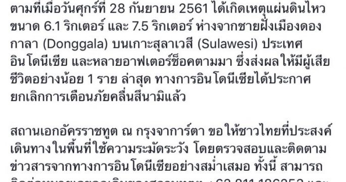 สถานเอกอัครราชทูต ณ กรุงจาการ์ตา ขอให้ชาวไทยที่ประสงค์เดินทางในพื้นที่ใช้ความระมัดระวัง โดยตรวจสอบและติดตามข่าวสารจากทางการอินโดนีเซียอย่างสม่ำเสมอ