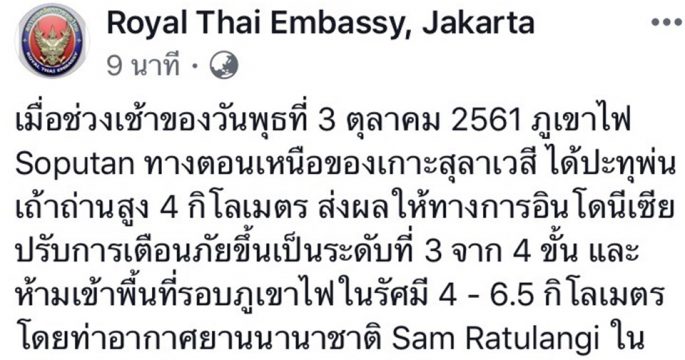 สถานเอกอัครราชทูต ณ กรุงจาการ์ตา เผย ภูเขาไฟ Soputan ทางตอนเหนือของเกาะสุลาเวสี ปะทุช่วงเช้า ทางการอินโดนีเซียปรับการเตือนภัยเป็นระดับ 3 และห้ามเข้าพื้นที่รอบภูเขาไฟ