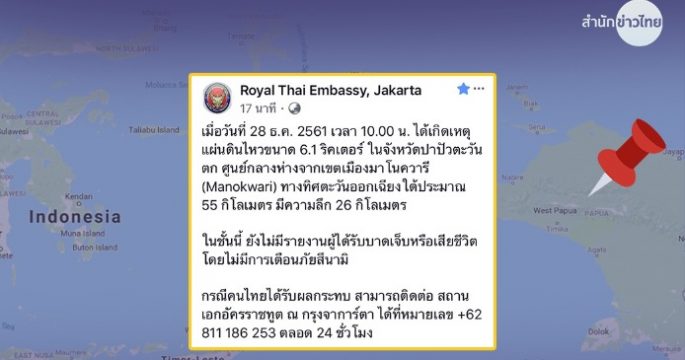 สถานเอกอัครราชทูตไทย ณ กรุงจาการ์ตา แจ้งยังไม่มีรายงานผู้ได้รับบาดเจ็บหรือเสียชีวิตจากเหตุแผ่นดินไหว ในจังหวัดปาปัวตะวันตก ขณะที่ไม่มีการเตือนภัยสึนามิ