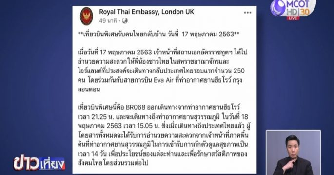 เที่ยวบินพิเศษที่ไปรับคนไทยชุดแรก 250 คน จากสหราชอาณาจักรและไอร์แลนด์ จะออกเดินทางจากท่าอากาศยานฮีทโธรว์ กรุงลอนดอน เวลา 21.25 น. และจะถึงท่าอากาศยานสุวรรณภูมิ วันนี้ เวลา 15.05 น.