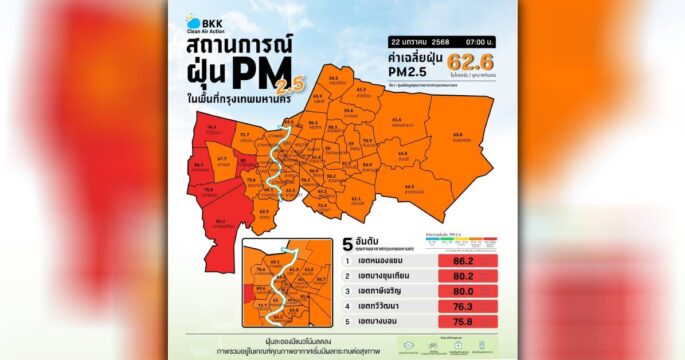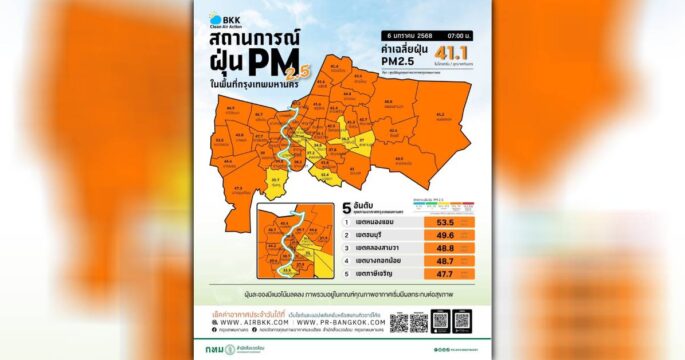 6 พื้นที่กรุงเทพฯ อ่วม อากาศแย่หนัก ฝุ่น PM 2.5 อยู่ระดับสีแดง มีผลกระทบต่อสุขภาพ อีก 64 พื้นที่อยู่ระดับสีส้ม เริ่มมีผลกระทบต่อสุขภาพ ย้ำสวมหน้ากากอนามัยขณะทำกิจกรรมนอกบ้าน