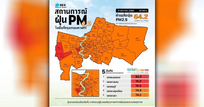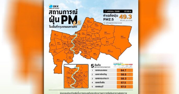 คุณภาพอากาศ กรุงเทพฯ เช้านี้ ตรวจวัดได้ 40.7-65.4 มคก./ลบ.ม. เกินมาตรฐานอยู่ในระดับสีส้ม เริ่มมีผลกระทบต่อสุขภาพ 70 พื้นที่