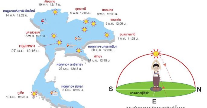 สดร.เผย เมษายน-พฤษภาคม ดวงอาทิตย์ตั้งฉากกับพื้นที่จังหวัดต่างๆ ของไทย สำหรับกรุงเทพฯ ตรงกับวันที่ 27 เมษายน 2560 แต่อาจไม่ใช่วันที่ร้อนที่สุดขึ้นอยู่กับปัจจัยอื่นรอบข้าง