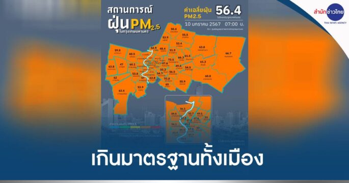 กทม.เช้านี้ ค่าฝุ่นระดับสีส้มเกินมาตรฐานทั้งเมือง แนะประชาชนสวมหน้ากากป้องกัน PM2.5 ทุกครั้งที่ออกนอกอาคาร