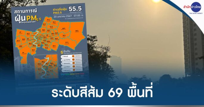 คุณภาพอากาศแย่ กทม.เช้านี้ ค่าฝุ่น PM2.5 เกินมาตรฐาน 69 พื้นที่ อยู่ในระดับสีส้ม เริ่มมีผลกระทบต่อสุขภาพ แนะจำกัดระยะเวลาทำกิจกรรมกลางแจ้ง
