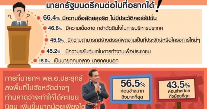 กรุงเทพโพลล์พบประชาชน ร้อยละ 66.4 ระบุนายกฯ คนต่อไป อยากให้เป็นผู้นำที่มีความซื่อสัตย์สุจริต และพบว่าประชาชนสนับสนุน พล.อ.ประยุทธ์ เป็นนายกฯ เพิ่มขึ้น