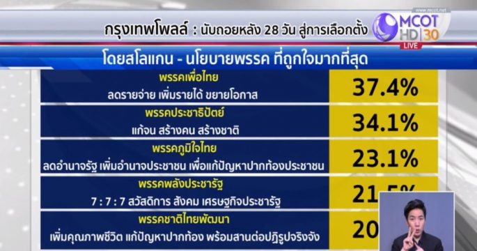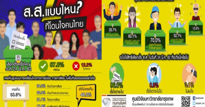 เปิดเผยผลสำรวจความเห็นประชาชนเกี่ยวกับการเลือกตั้งในอีก 28 วันข้างหน้า ปรากฏว่าส่วนใหญ่ชอบนโยบาย “เพื่อไทย” แต่ส่วนหนึ่งพร้อมหนุน “พล.อ.ประยุทธ์” นั่งนายกรัฐมนตรี แต่ทว่าส่วนใหญ่ยังไม่ตัดสินใจจะเลือกตั้ง