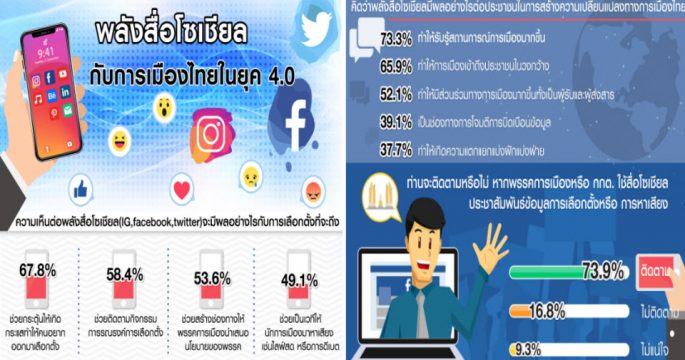 “กรุงเทพโพลล์” สำรวจความคิดเห็นประชาชน เรื่อง “พลังสื่อโซเชียลกับการเมืองไทยยุค 4.0” พบประชาชนร้อยละ 67.8 เห็นว่าการเลือกตั้งที่จะถึงนี้ พลังสื่อโซเชียลจะช่วยกระตุ้นให้เกิดกระแสทำให้คนอยากออกมาเลือกตั้ง