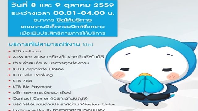 ธนาคารกรุงไทยปิดระบบอิเล็กทรอนิกส์ชั่วคราว 8-9 ต.ค.นี้ พัฒนาและเพิ่มประสิทธิภาพระบบงาน