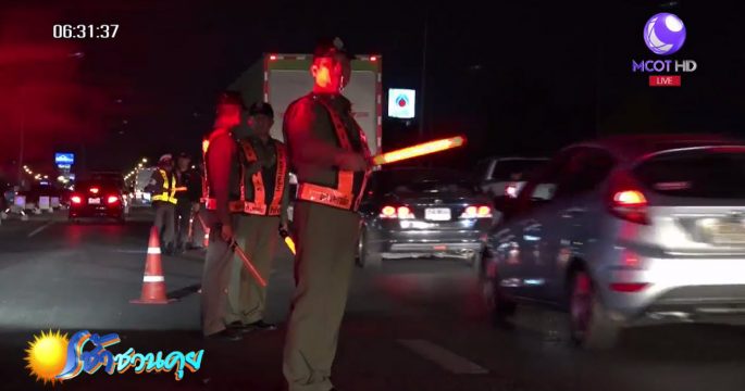ผู้การโคราช เป่านกหวีดโบกรถข้างถนน อำนวยความสะดวกการจราจร ส่งพี่น้องชาวอีสานกลับกรุงเทพฯ บริเวณถนนบายพาส มีรถหนาแน่น